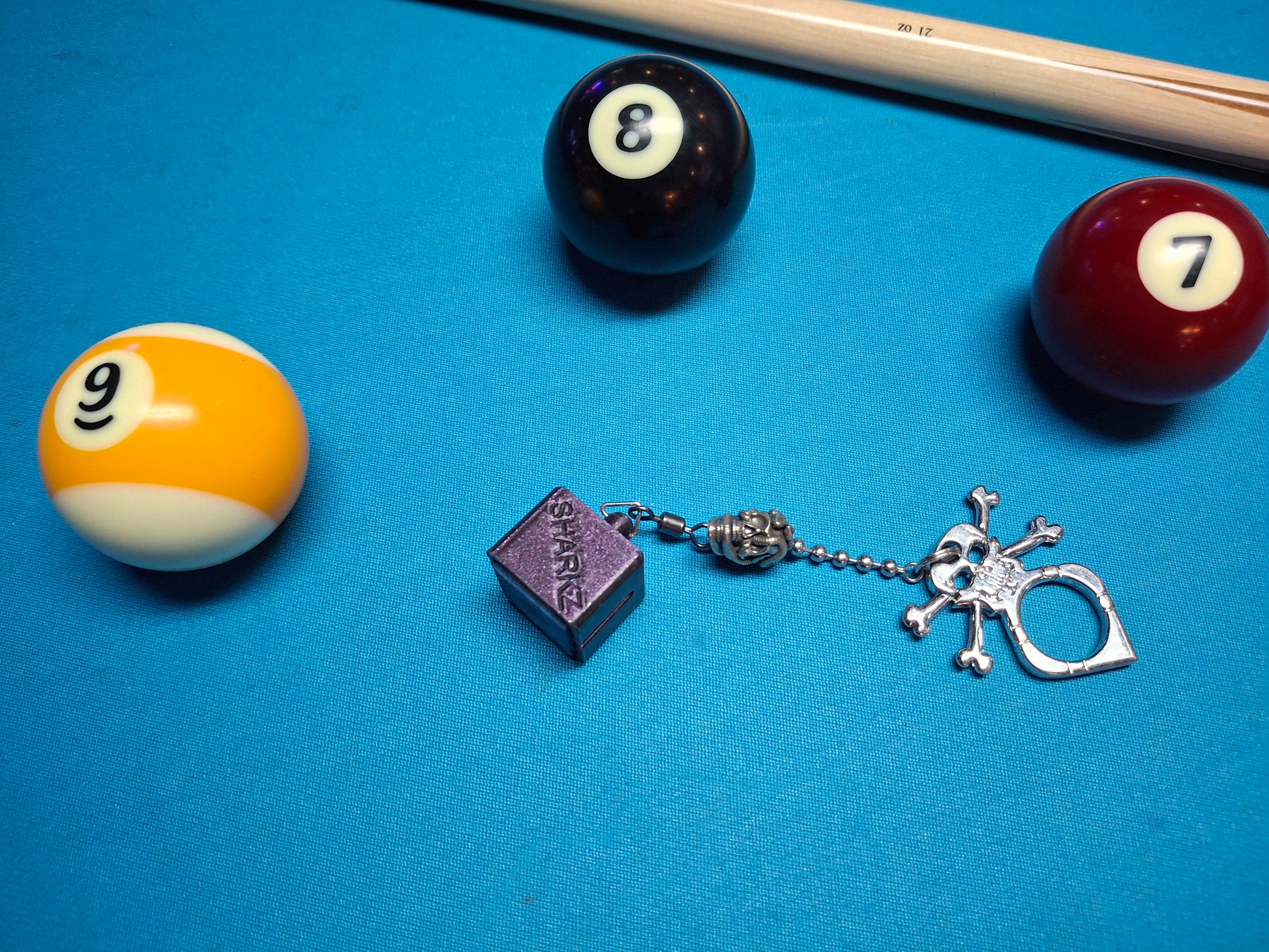 Chrome skull and cross bones attached to strong swivel chain. This chalk holder will put the cool into your game and help make the opponent sick with envy.